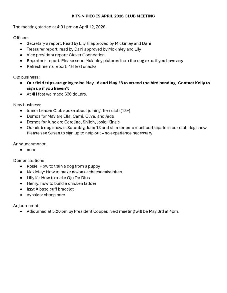 Sunday, April 12th @ 4pm the Origins Arena classroom. We talked about the upcoming Club Dog Show and asked that all families help out on June 13th. We had 6 club demonstrations from Aynslee, Henry, Izzy, Lilly K., McKinley and Rosie. We look forward to another great year!